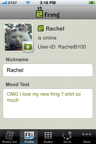 The new version includes a new user profile, which allows you to update your fring nickname, avatar and mood text, and broadcast it back to your IM friends. You can also see your friends’ avatars and mood texts from other networks – currently on Skype, others coming soon.