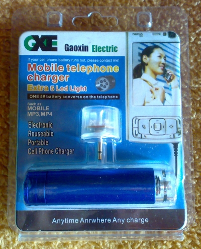My ever growing wish list of mobile techno gadgets got a much needed boost last week, after my parents returned from a trip to Thailand. I would like to take this opportunity to thank them for taking the time to fring me from Thailand and for getting me some cool new gadgets.Todays gadget on review is my all new mobile telephone charge or ‘Emergency Mobile Phone Charger‘. The device which is no bigger than a tube of lipstick acts as an emergency power source for a wide array of mobile devices and after testing I can say this device could come in very handy one day. The unit is powered by a single AA batter.