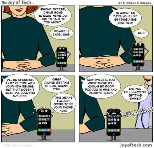 Genial esta historieta de The Joy of Tech donde muestran como los padres del iPhone le explican que dentro de poco va a tener un hermano y este se pone celoso.