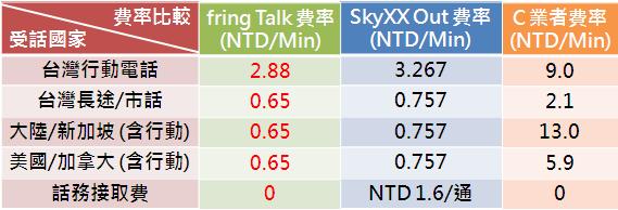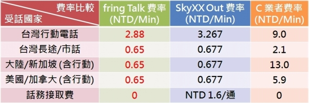 fring Talk 網路電話費率比較表