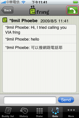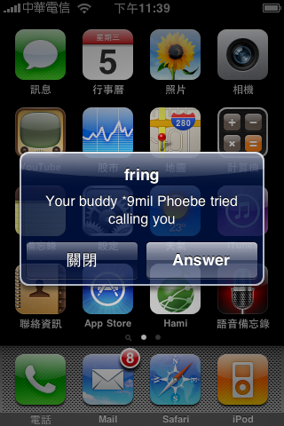 中文聊天、網路電話也是沒問題的喔,一樣可以離線接收,點選 Answer 後按右上角的綠色電話小按鈕,就可以和好友通免費的網路電話囉