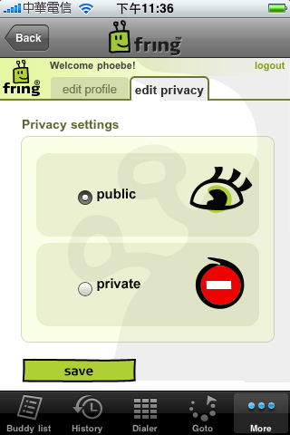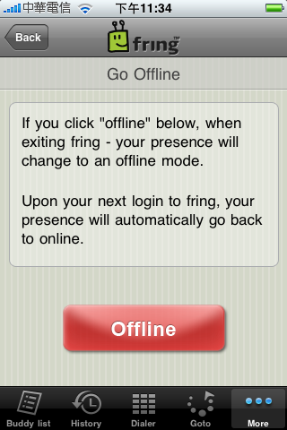 如果想要省電一點,不要一直掛在線上,可以進入 More->Go Offline 中點選下方大大的紅色按鈕,則此次關閉 fring 後就不會掛在線上囉