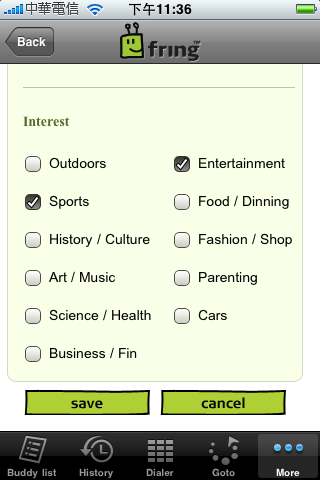 還可以從 More->My Profile 去更新 fring 用戶個人專屬頁面