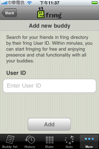 最近 fring 力推的「找好友」當然也沒問題啦,點選 More->Add new buddy,就有會出現兩種新增好友的方式,一種是「透過好友 fring 用戶 ID (By fring User ID)」,一種則是「透過手機通訊錄 (By phone contact)」
