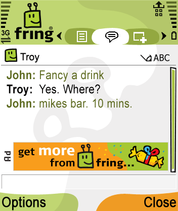 We wanted to give you the heads-up, as you may soon see small clickable advertising banners in the fring chat window, beneath the chat itself. Clicking the ad will open your browser and take you to the advertiser’s site; you may even find extra special offers, cool promos & other nice surprises behind the click from time to time :-) And, more clicks mean happy advertisers; and happy advertisers mean more resources for us to develop cool new stuff for you to play with in fring!